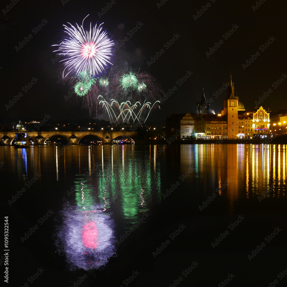 New Year's colorful fireworks with reflection on the river surface, festive mood