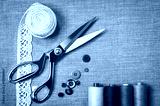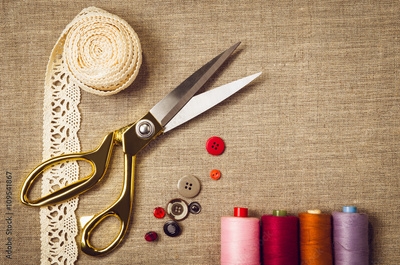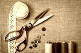 Background with sewing and knitting tools and accesories. Set for needlework placed on flax fabric. Image taken from above, top view. A lot of copyspace.