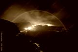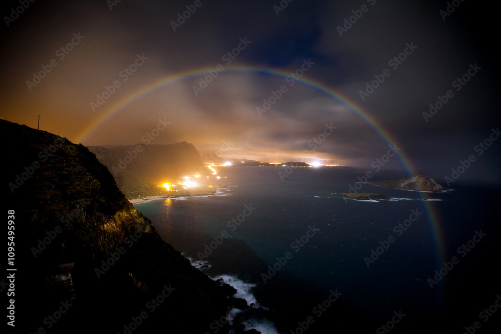 Perfect rainbow over Hawaiian islands and ocean - sunset through clouds