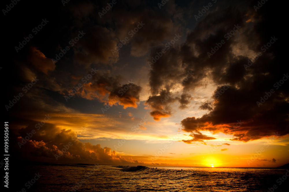 Majestic sunset reflecting off parting storm clouds and beautiful ocean