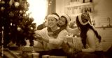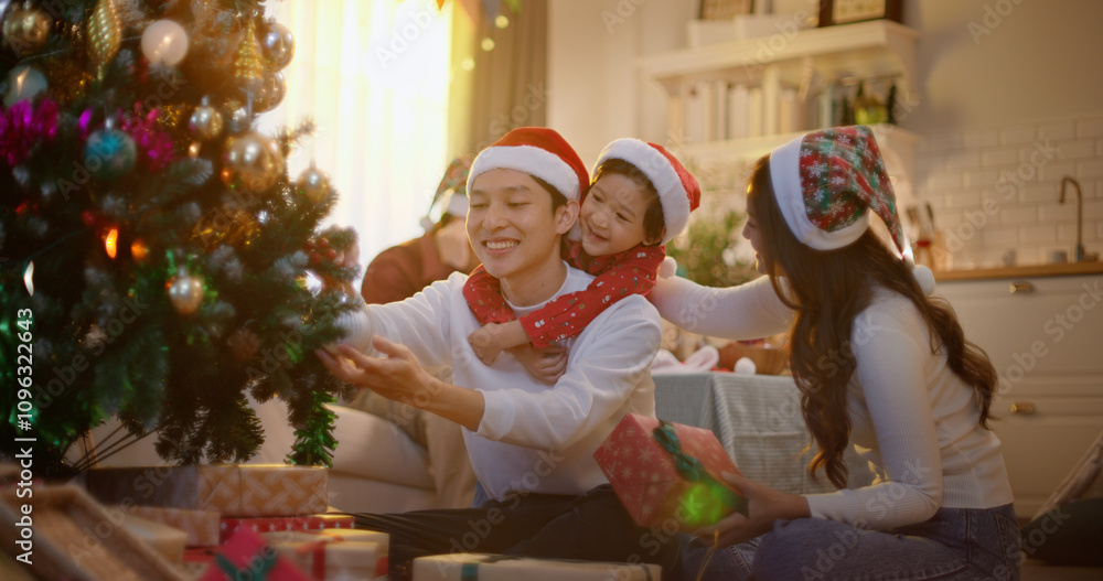 Happy family preparing New Year winter holidays celebration. Smiling young asian mother, father and son enjoy decorating xmas toy on christmas tree create festive mood atmosphere at home together.