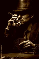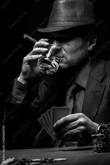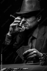 Male gambler playing poker, drinking whiskey and smokes a cigar, Black and white