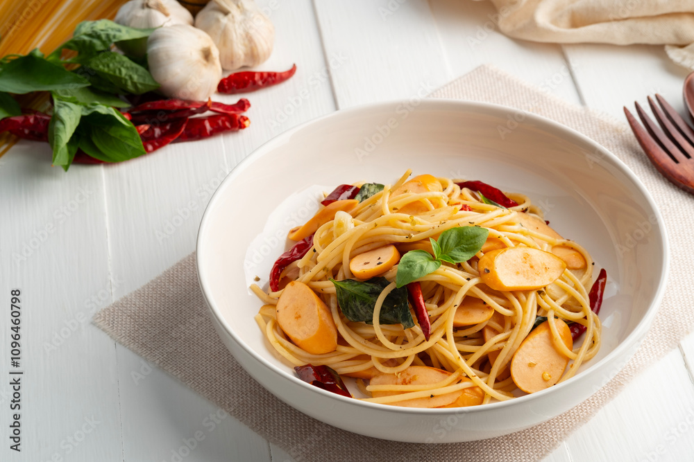 Spaghetti with Sausage and Dried Chili.Spicy stir fried Spaghetti with smoky bite ,garlic and crispy chilli in white plate.