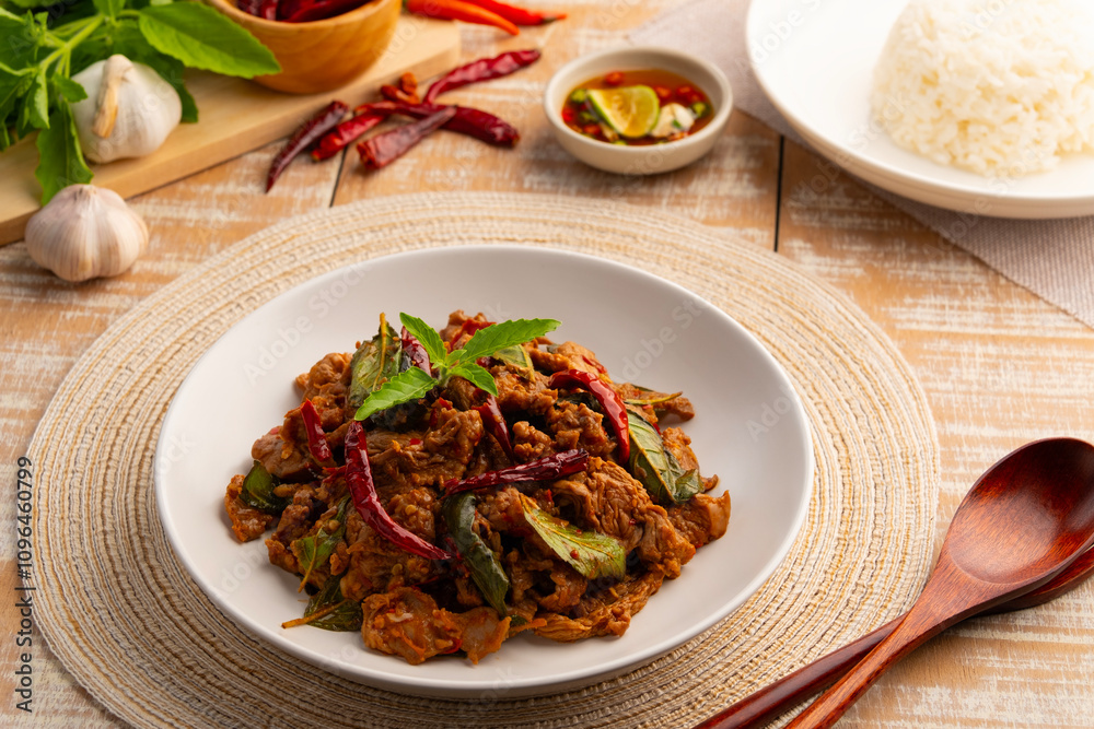 Stir fried sliced Beef with dry chilli and Holy Basil in white plate.Thai famous food (pad kra pao prik hang).