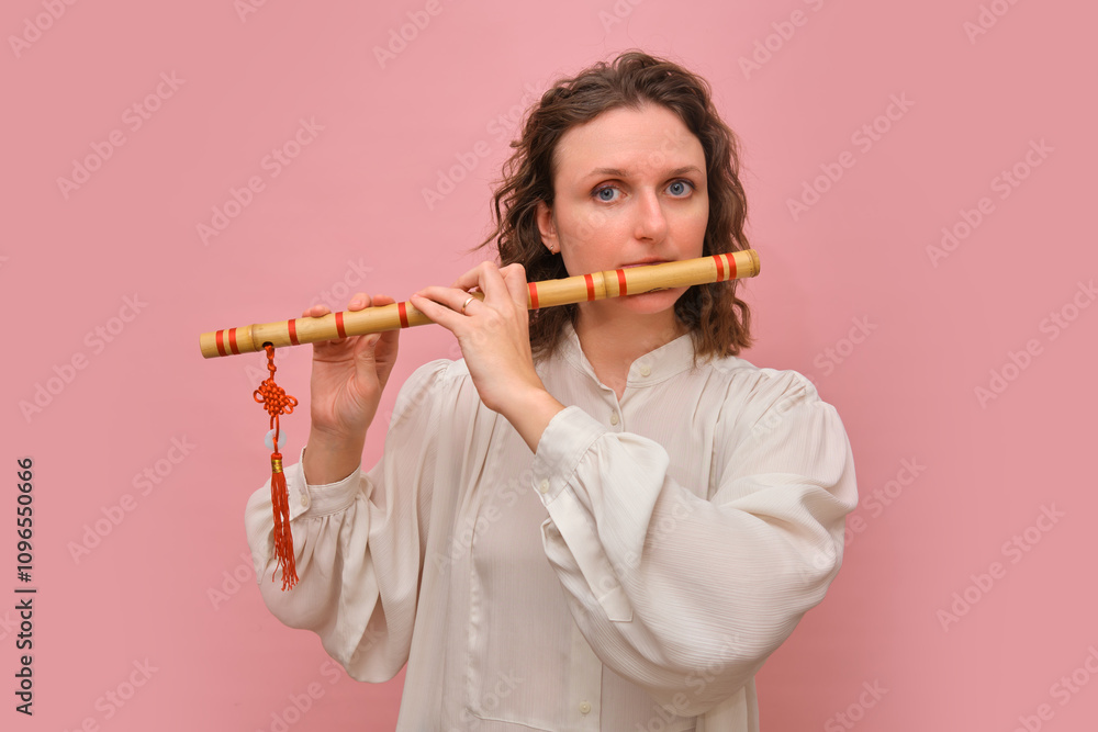 Woman playing bamboo flute decorated with red tassel. Studio portrait on a pink background. Musical performance and traditional culture concept.
