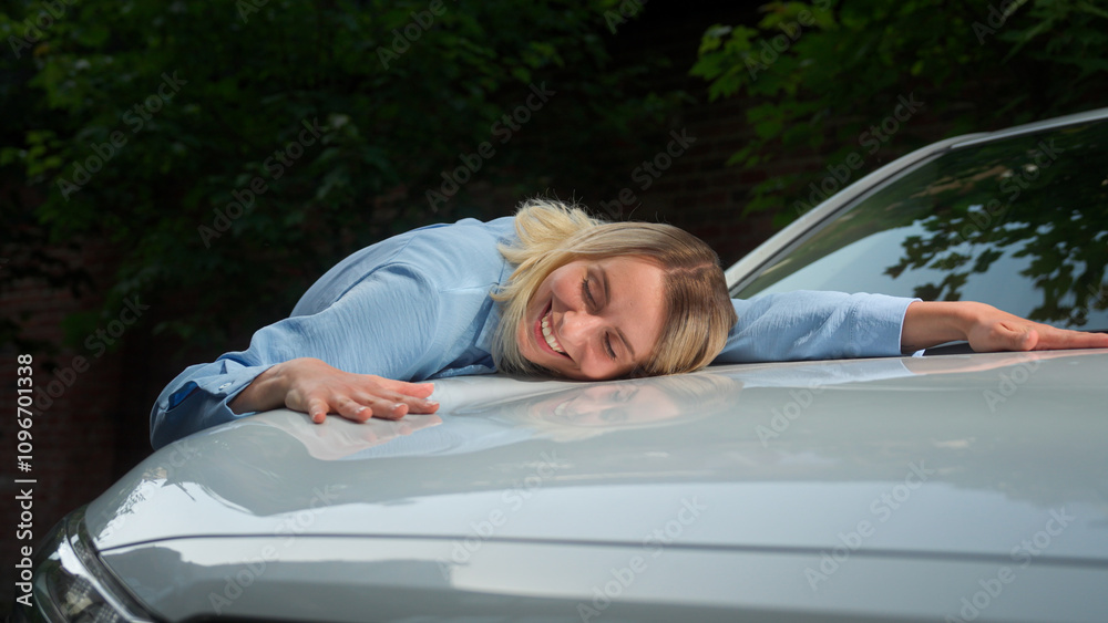 Cheerful satisfied Caucasian female automobile owner client woman girl buyer cuddle car lying on auto in city electric transport rent service businesswoman vehicle driver rejoicing new purchase smile
