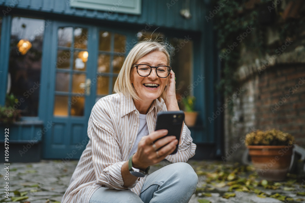 smile mature woman owner sit in front restaurant and use mobile phone