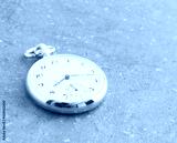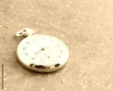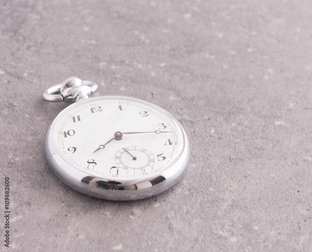 Pocket watch lying on stone table. Vintage timepiece still life. Concept of time, deadline and nostalgia.