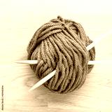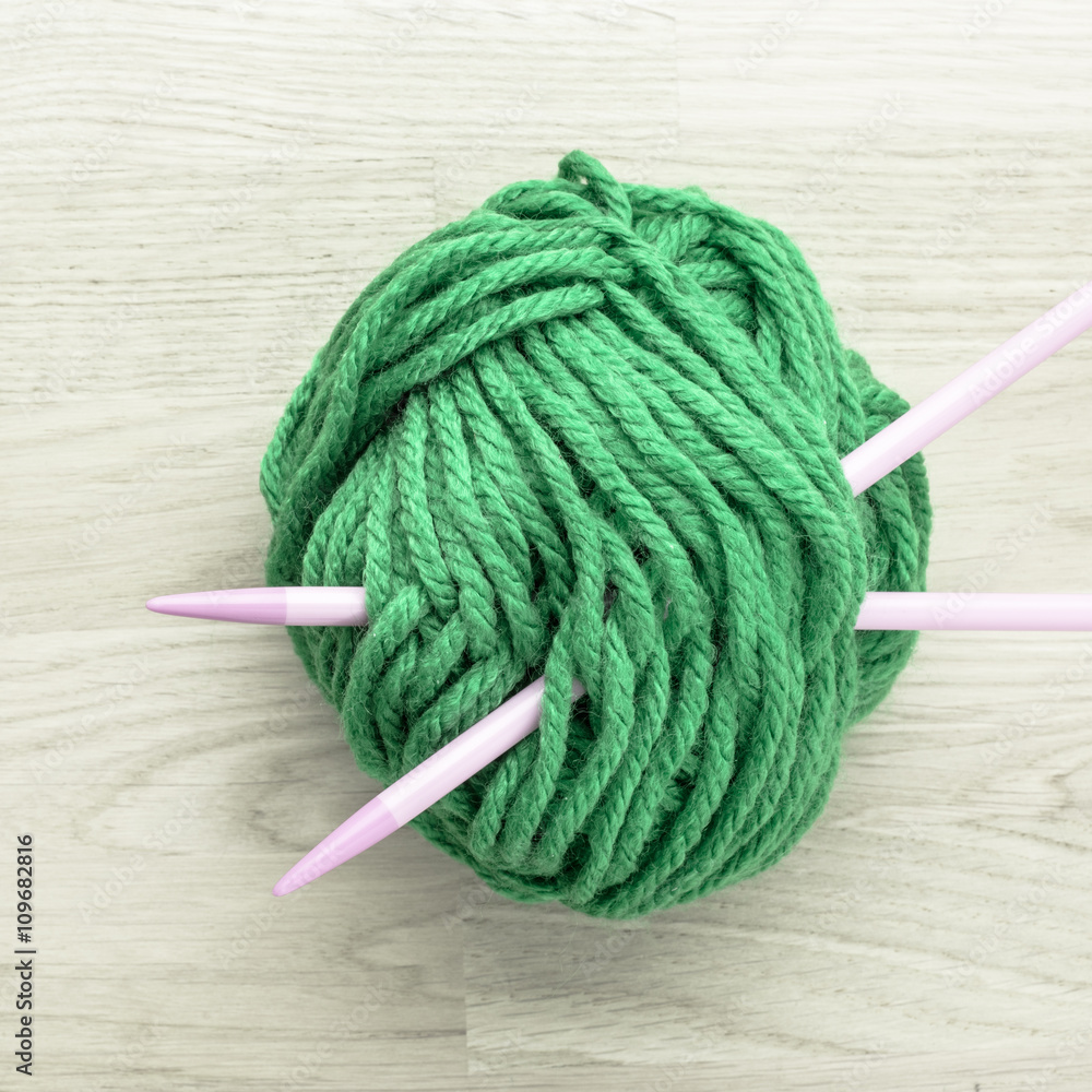 Ball of yarn and knitting needles on wooden table. The needlework thread is green. Concept of traditional hobby and a creative leisure activity.