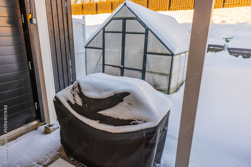 Snow-covered barbecue grill and greenhouse in backyard during cold winter morning. Sweden.