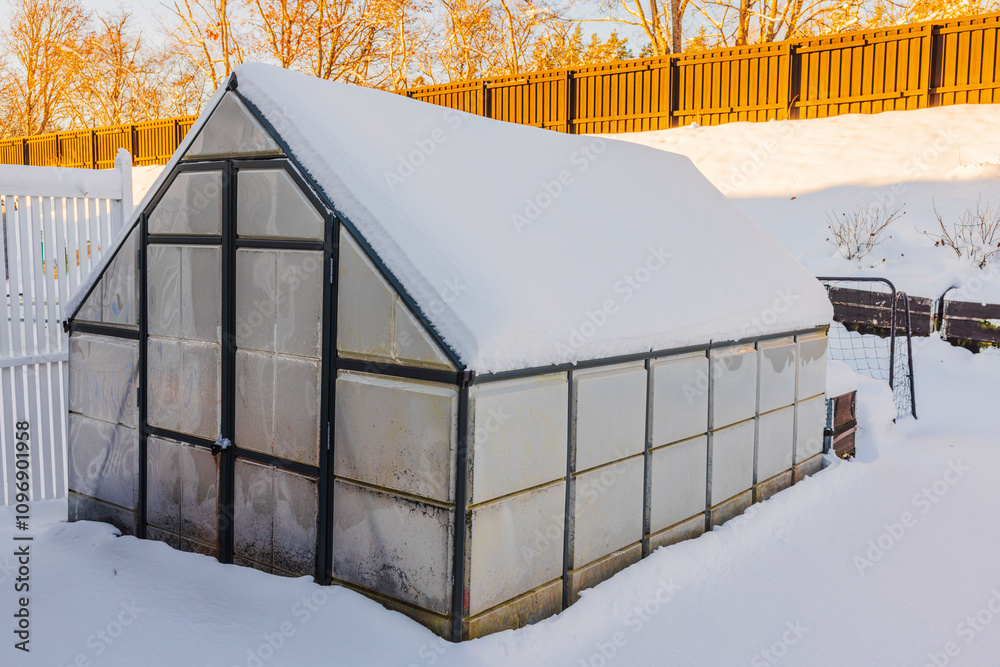 Snow-covered greenhouse in backyard surrounded by deep snow during sunny winter day. Sweden.