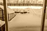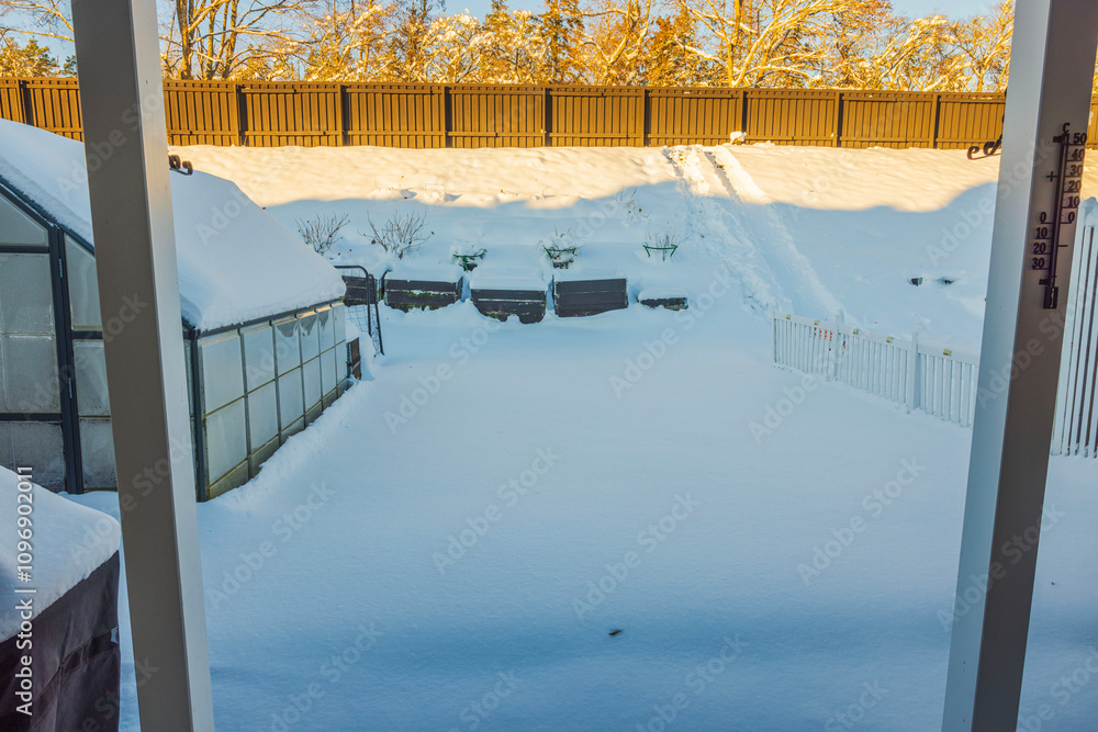 Snow-covered backyard with greenhouse, planters and wooden fence under soft light of winter morning. Sweden.