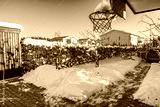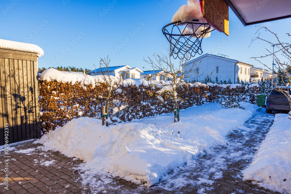 Snow-covered courtyard with cleared path, bare trees, and basketball hoop, surrounded by sunlight and frosty landscape. Sweden.