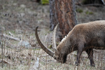 herd of steinbock capricorns grazing in Pontresina, Graubuenden, during summer. Ibex herd.