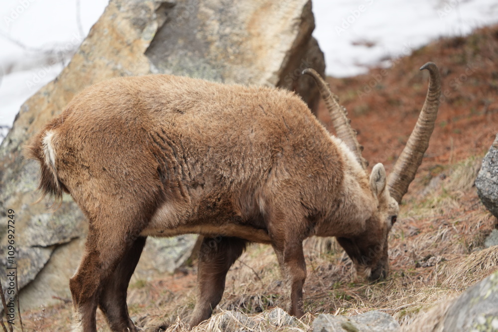 herd of steinbock capricorns grazing in Pontresina, Graubuenden, during summer. Ibex herd.