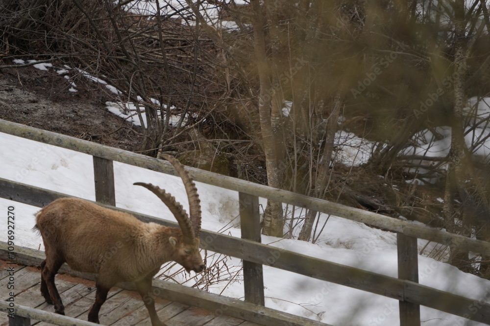 herd of steinbock capricorns grazing in Pontresina, Graubuenden, during summer. Ibex herd.