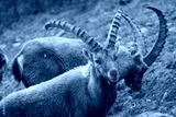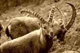 herd of steinbock capricorns grazing in Pontresina, Graubuenden, during summer. Ibex herd.