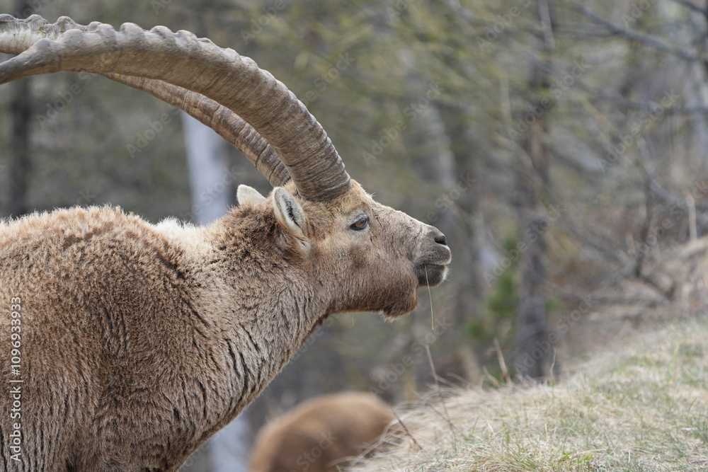 herd of steinbock capricorns grazing in Pontresina, Graubuenden, during summer. Ibex herd.