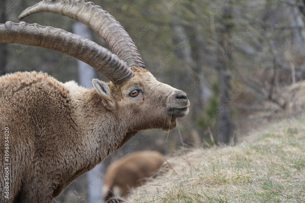 herd of steinbock capricorns grazing in Pontresina, Graubuenden, during summer. Ibex herd.