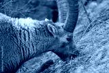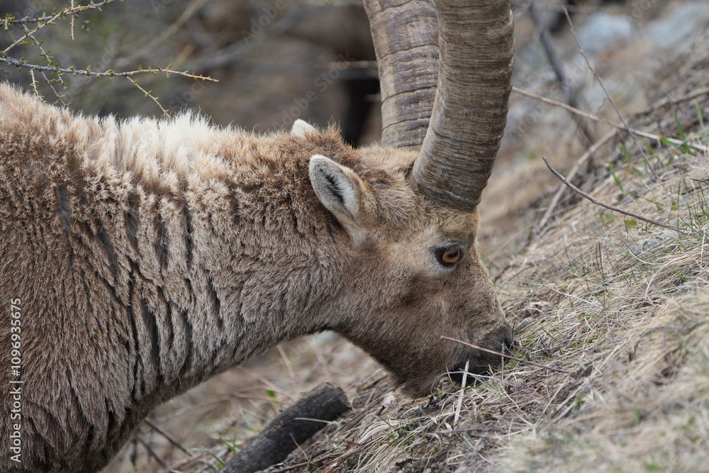 herd of steinbock capricorns grazing in Pontresina, Graubuenden, during summer. Ibex herd.