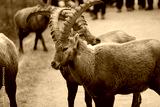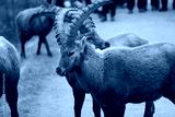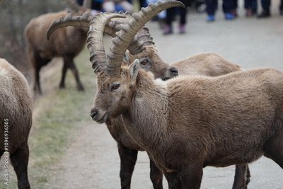 herd of steinbock capricorns grazing in Pontresina, Graubuenden, during summer. Ibex herd.