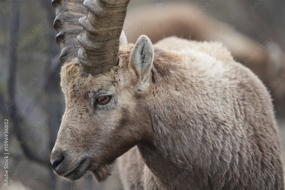 herd of steinbock capricorns grazing in Pontresina, Graubuenden, during summer. Ibex herd.