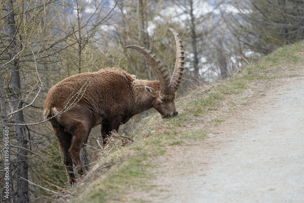 herd of steinbock capricorns grazing in Pontresina, Graubuenden, during summer. Ibex herd.