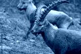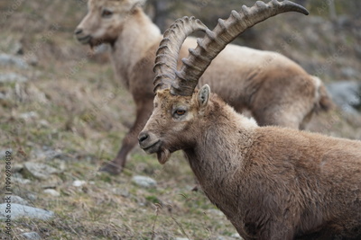 herd of steinbock capricorns grazing in Pontresina, Graubuenden, during summer. Ibex herd.