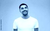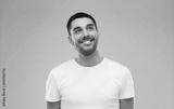 smiling man looking up over gray background