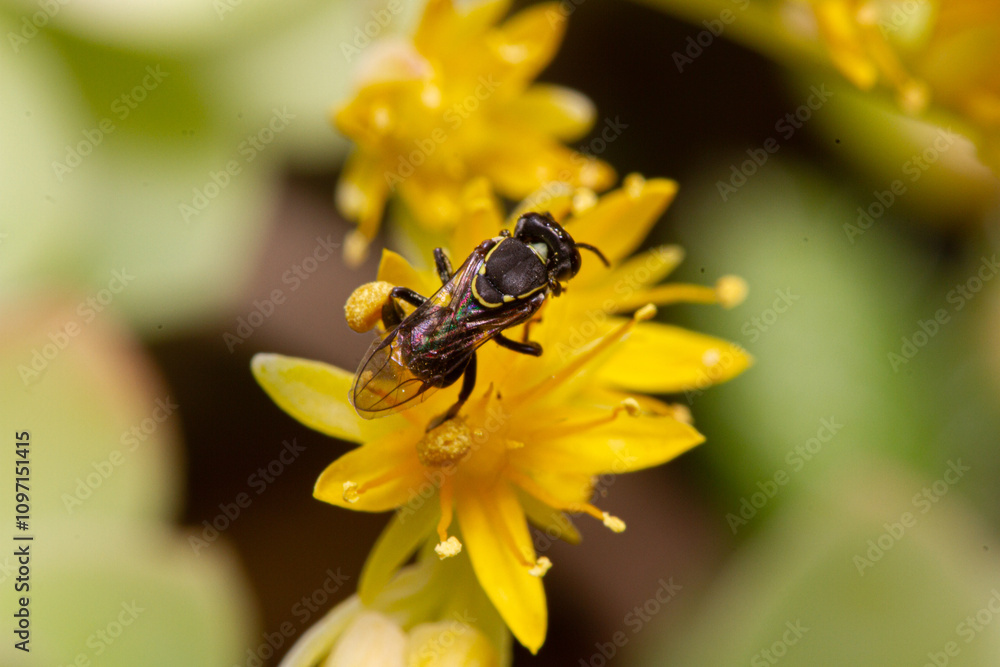 Stingless Bee from Brazil in Yellow Echeveria Succulent Flowers Macro