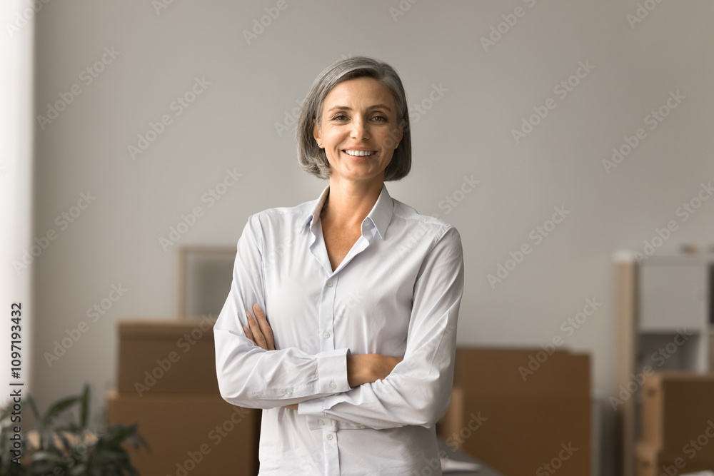 Happy confident grey haired businesswoman posing for portrait in e-commerce storage, looking at camera with folded arms and toothy smile, enjoying work on Internet store project