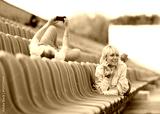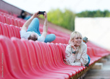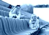 The guy and the girl lie on benches of stadium.
