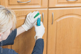 Woman is cleaning the furniture with a sponge and detergent, which she is hilding in her hands. All potential trademarks are removed.