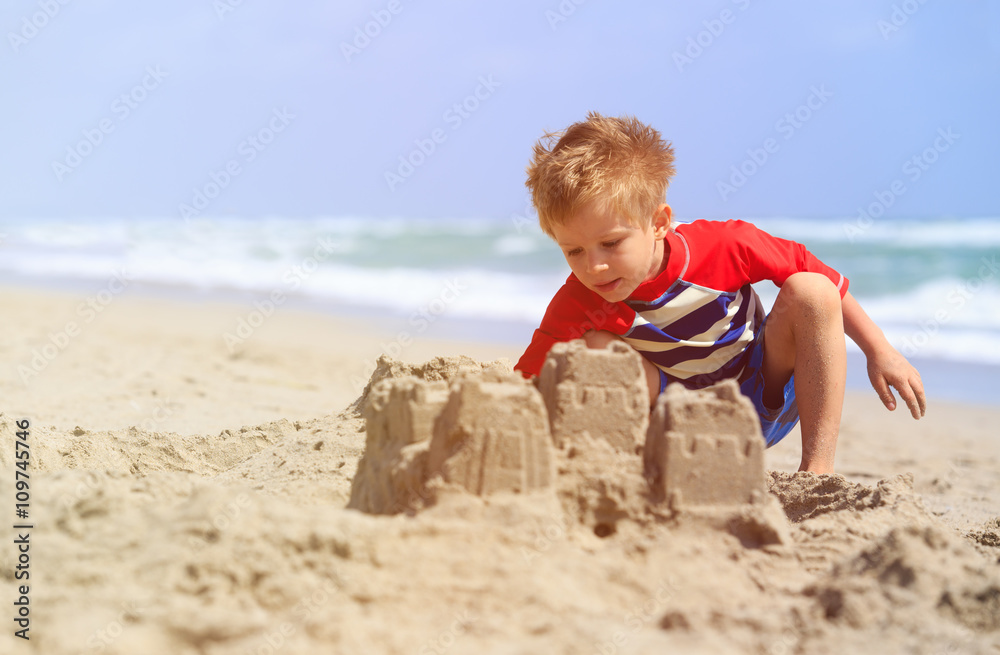 little boy play with sand on summer beach