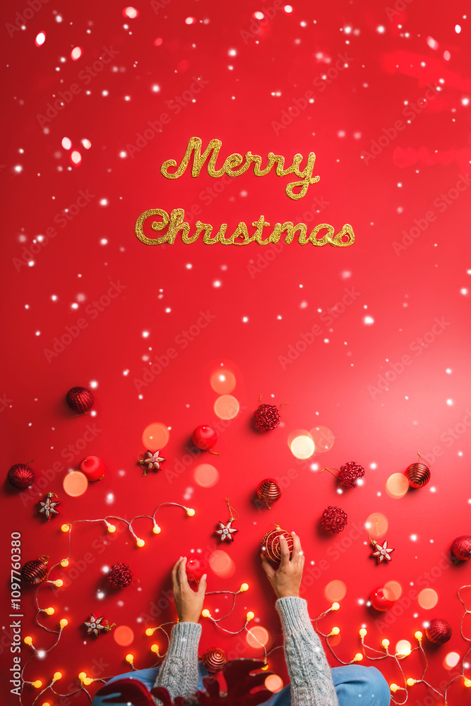 The girl is using the hand to hold the ball red decorations On a red background with christmas ornaments with led light. Top view. Christmas family traditions. Concept christmas.