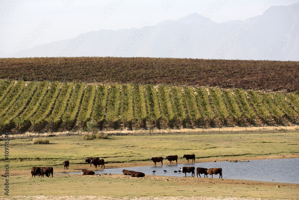 Cattle grazing below vineyards at Autumn time in Riebeek Kasteel in the Swartland region of South Africa