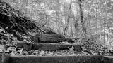 Wooden stairs covered in leaves and surrounded by lush greenery in a forest, evoking adventure and exploration