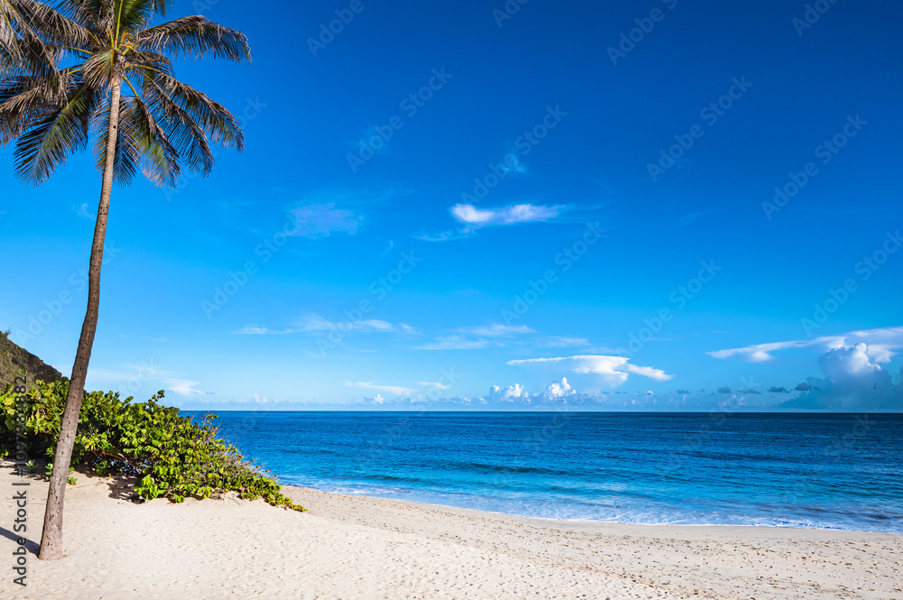 A beautiful beach with palm trees and a clear blue sky