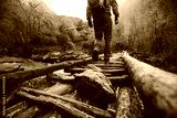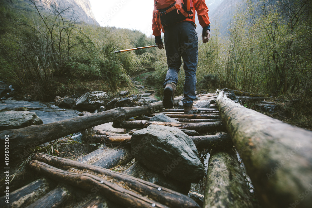 Hiker crossing the bridge in Himalayas