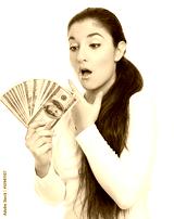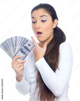 Portrait of a nice looking woman holding bunch of banknotes