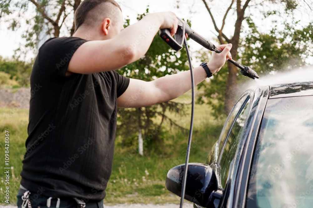 Man Using Pressure Washer to Clean Car Exterior in Natural Setting