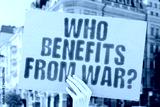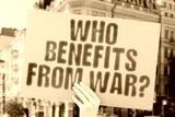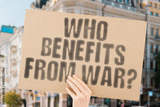 The phrase 'Who benefits from war?' on a banner in a person's hand. Human holds a cardboard with an inscription. Conflict. Power. Economy. Technology. Weapons. Politics. Strategy