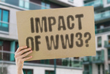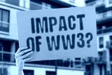 The phrase 'Impact of WW3?' displayed on a banner held by a person. Future conflict and its effects. War. Peace. Global. Consequences. Humanity. Recovery. Tensions