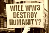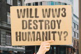 The phrase 'Will WW3 destroy humanity?' displayed on a banner held by a person. Large-scale war. Survival. Destruction. Future. Humanity. Conflict. War. Fragility