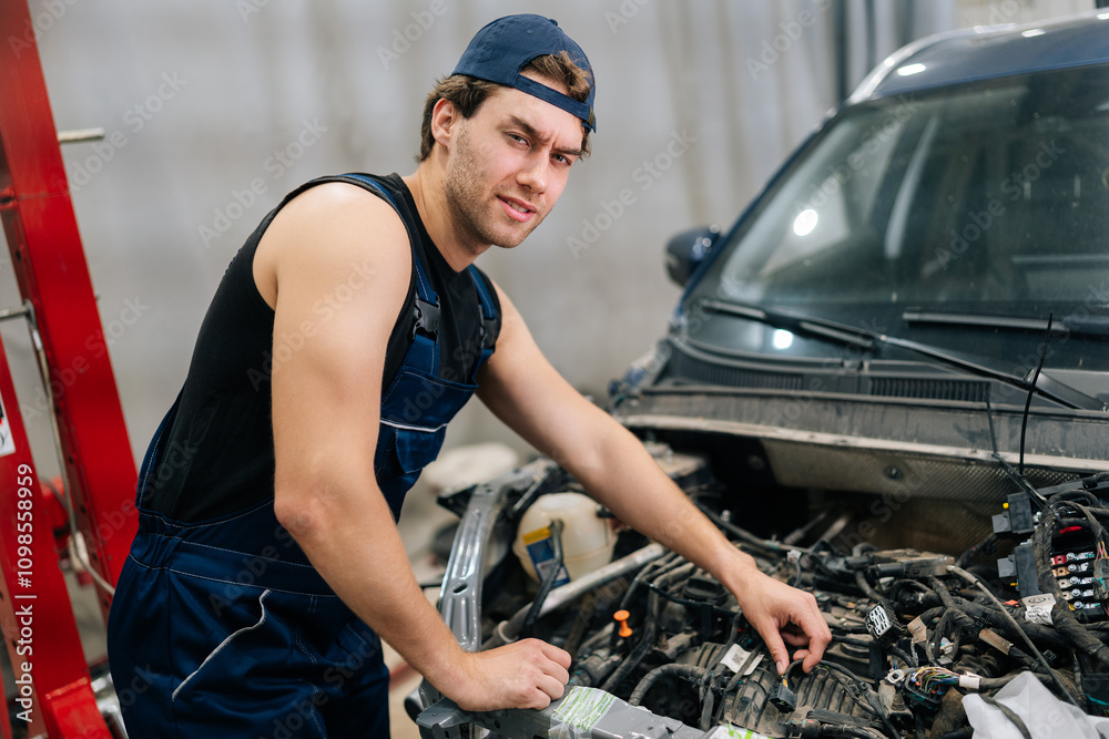 Portrait of concentrated mechanic male examining car engine in auto repair shop, looking at camera with serious expression. Skilled repairman inspecting car engine in garage vehicle service.
