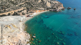Aerial drone photo of secluded volcanic beach of Kastanas with colourful rock formations and crystal clear emerald sea, island of Milos, Cyclades, Greece