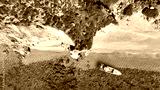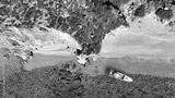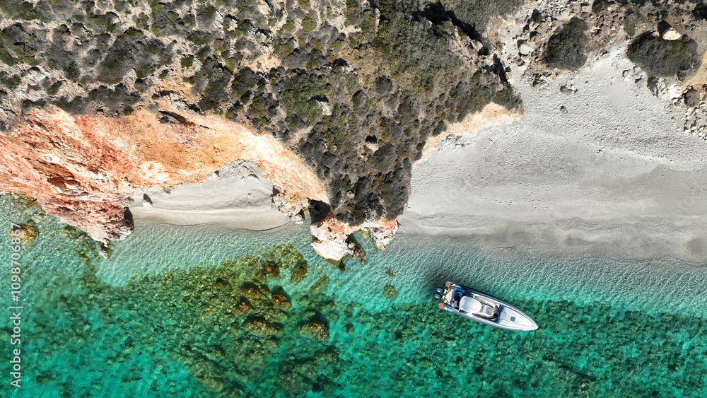 Aerial drone top down photo of inflatable rib boat anchored in paradise volcanic cove with emerald sea