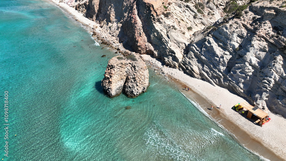 Aerial drone photo of famous paradise beach of Firiplaka with crystal clear emerald sea, Milos island, Cyclades, Greece