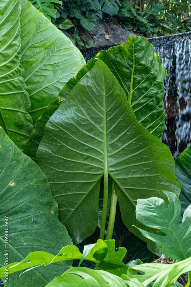 Close up of big green leaves inside the Yumenoshima Park Tropical Greenhouse Dome in Tokyo, Japan.