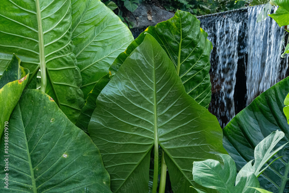 Close up of big green leaves inside the Yumenoshima Park Tropical Greenhouse Dome in Tokyo, Japan.